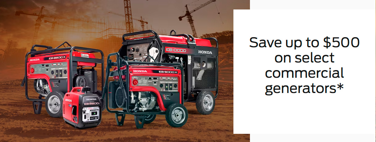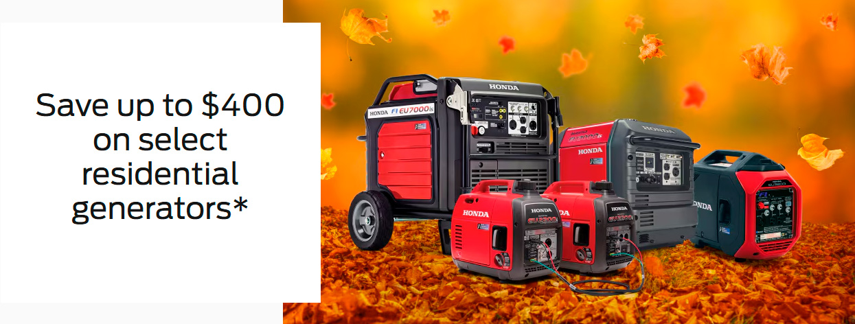 LEGAL: * Discount is available with the purchase of a select new and previously unregistered Honda generator from a participating Honda Power Equipment dealer in Canada between October 1, 2025 and December 31, 2025. Discount is: (i) $100 (EU2200iTC, EU22000iTC1); (ii) $125 (EB2200iTC); (iii) $200 (EU3200i); (iv) $250 (EU3000isC4, EB5000X3CT2); (v) $300 (EB6500XCT2); (vi) $400 (EU7000isCT1); (vii) $500 (EB10000C1). Discount: (i) will be deducted from the negotiated selling price before applicable taxes; (ii) cannot be applied to past transactions; (iii) has no cash surrender or other value; and (iv) may not be combinable with certain other offers. Conditions apply. See your Honda dealer for full details.